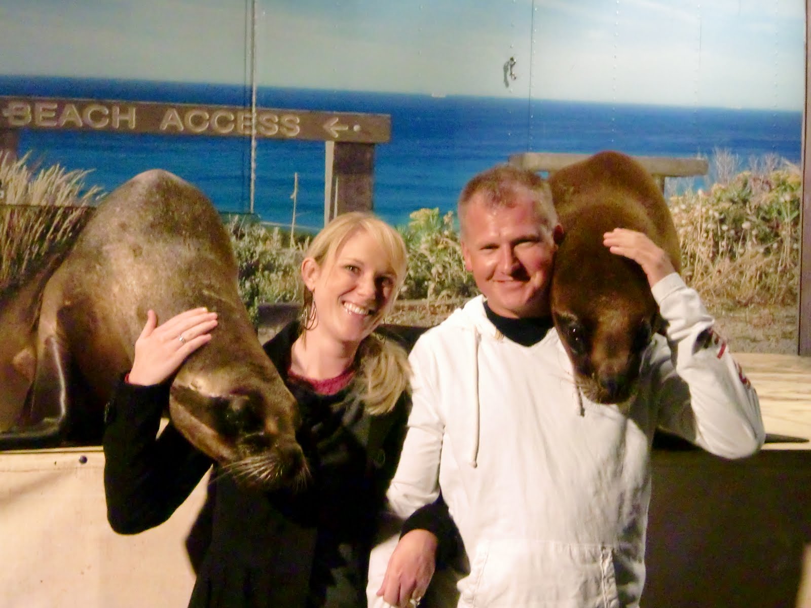 On Friday Cameron and I went to the State fair with our friends Stacy and Casey. It was a lot of fun. We of course had to get our picture next to the police car and then as we were walking around we saw that you could get your picture with sea lions. Cameron thought it was so cool and really wanted to do it, so we did. It was pretty cool. As soon as you stand against the stage they put their head on your shoulder. Who knew you could do such cool things at the State fair.